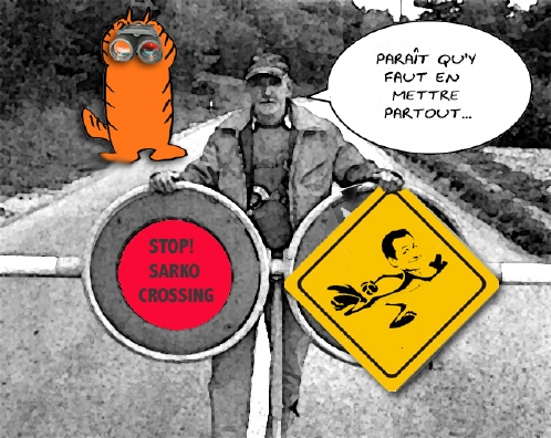 D’ordinaire, Guillaume réserve ses coups de patte graphiques à une poignée d’irréductibles fans, qui reçoivent épisodiquement par mail son point de vue sur l’actualité, mélange de dessins, photos, images et bribes de presse internationale. Guillaume-le-chat-orange-qui-commente-l’actualité internationale ou locale n’a pas toujours été aussi discret. Fut un temps où son inénarrable faconde imprégnait quotidiennement les rétines des visiteurs d’Un regard moderne, pas la librairie parisienne, non, le site web de commentaires en images de l’actualité, qui, de 2002 à 2005, était fréquenté par Loulou et Kiki Picasso, Placid, Olivia Clavel, L.V.P. (la vermine persistante) et quelques autres figures d’un mouvement informel, composé de graphistes, cinéastes et vidéastes qu’on appellerait aujourd’hui activistes. Créé par le « groupe d’action graphique » Bazooka, Un regard moderne avait sévi à la fin des années 70 dans « Libération » avant que Bazooka ne tente de « foutre la merde » (selon les termes d’Olivia Clavel) dans d’autres journaux. Poptronics est plus que fier de présenter la dernière carte d’actu-postale de Guillaume.
