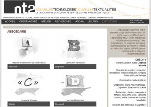 Abécédaire du Web : 26 concepts pour penser la création sur Internet, une édition en ligne du NT2 (nouvelles technologies nouvelles textualités), le laboratoire de recherche sur les œuvres hypermédiatiques, de l’UQAM, l’université de Montréal.