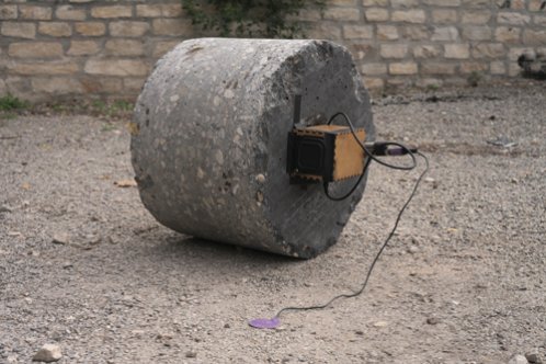 « Pierre qui roule » (trouvée par Direct Out à Aix, équipée d’un micro contact et d’un mini ampli), déposée devant leur pièce vidéo à l’école d’art d’Aix-en-Provence pour le festival Gamerz. © Direct Out