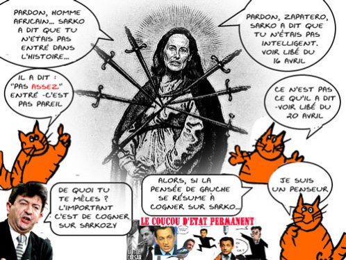 Ségolène est-elle la mater dolorosa de la politique française ? Ses « excuses » au chef du gouvernement espagnol, une semaine seulement après ses « excuses » aux Africains (le tout pour contre-balancer les propos d’un Nicolas Sarkozy légèrement en roue libre), sont-elles si scandaleuses ? Et re-voilà le schéma de la campagne présidentielle, quand le match Ségo/Nico tournait à l’affrontement de deux icônes médiatiques : la question de fond (Sarkozy est-il à la hauteur des enjeux internationaux du moment ?) est bien plus intéressante que l’écume agitée autour de ces excuses. Résumons. Ségolène campe la meilleure alternative à Nicolas Sarkozy pour 2012. C’est en tout cas ce qu’elle tente de faire croire avec sa stratégie de harcèlement présidentiel, malgré son échec pour prendre le PS et les peaux de banane multiples que lui glissent sous les pieds ses « amis » socialistes. Elle occupe en tout cas le terrain de l’opposition teigneuse à un Sarkozy omni-président. A l’étranger aussi, puisqu’une stature présidentielle se gagne sur ce front-là également. Elle ouvre le bal en Afrique, en présentant ses excuses pour le discours controversé de 2007 du président français et cette petite phrase, « le drame, c’est que l’homme africain n’est pas assez entré dans l’Histoire ». Habile ? Pas si sûr... Une semaine plus tard, elle remet ça, et dans les mêmes termes encore, dans une lettre à Zapatero où elle demande pardon pour les « propos injurieux » de Sarkozy. C’est « Libération » qui avait révélé l’étendue des dégâts du déjeuner post-G20 entre le président et des parlementaires de la majorité comme de l’opposition, au cours duquel ledit Sarkozy s’est un tout petit peu lâché sur ses congénères, traitant l’un de « pas très intelligent », l’autre d’inexpérimenté et on en passe. Les médias étrangers s’en sont émus, la presse française n’a pas trop embrayé, préférant darder ses flèches sur notre madone de l’opposition... D’accord, refaire le coup de l’excuse prête à rire, mais les propos des uns et des autres pour démentir ou expliquer les dérapages multiples de Nicolas Sarkozy ne sont-ils pas bien pires ? Ainsi de Bernard Kouchner qui explique que si Nicolas Sarkozy a bien dit de Zapatero qu’il n’était pas très intelligent, c’était qu’il voulait dire le contraire (ben oui, quoi, c’est comme ça qu’il s’exprime, Nicolas...). Ou encore de Jack Lang, autre grand ami de Ségolène, qui ne trouve rien mieux que de dire : « J’ai envie de dire à nos amis espagnols : excusez-la, pardonnez-lui ! » Sans oublier le déchaînement des proches de Nico : le nouveau patron de l’UMP Xavier Bertrand qui parle de Ségolène Royal comme d’une « spécialiste de la manipulation », Frédéric Lefebvre, le très spécial porte-parole de l’UMP, qui demande carrément une « aide psychologique » pour la dame. Un bien beau débat, ma fois, se dit Guillaume-en-Egypte au bord d’entrer en politique... Chez poptronics, on voterait volontiers pour un chat-président...
